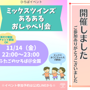 A-3.ピアサポーター活動 【活動報告】ミックスツインズあるあるおしゃべり会 2021年10月から開始した『ふたごのひろば(oVice)』にて、音声だけで楽し…… 2025.12.02 A-3.ピアサポーター活動 【開催報告】ふたごみつごパパあつまれ~! 2021年10月から開始した『ふたごのひろば(oVice)』にて、音声だけで楽し…… 2025.11.25 A-3.ピアサポーター活動 【活動報告】関西在住のふたごみつごママ集まれ〜♡ 2021年10月から開始した『ふたごのひろば(oVice)』にて、音声だけで楽し…… 2025.11.11 A-3.ピアサポーター活動 【活動報告】多胎シングルママだけで話そうよ〜第46回 2021年10月から開始した『ふたごのひろば(oVice)』にて、音声だけで楽し…… 2025.10.24 A-3.ピアサポーター活動 【活動報告】多胎プレパパママ教室〜多胎の妊娠・出産・育児について 「多胎プレパパママ教室〜多胎の妊娠・出産・育児について」ANNAさん&ココナツさ…… 2025.10.23 A-3.ピアサポーター活動 【活動報告】関西在住のふたごみつごママ集まれ〜♡ 2021年10月から開始した『ふたごのひろば(oVice)』にて、音声だけで楽し…… 2025.10.22 12345»最後 »