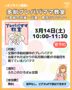 事前にいただいていた質問にすべてお答えできておらず心苦しいのですが、4月のゆるトーク会やまた次回の多胎プレパパママ教室でみなさまとお話しできたらと思います。