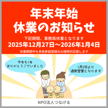 年末年始休業のお知らせ 2025.12.24 プレスリリース 【延長決定】グリコ液体ミルク多胎児家庭支援 2025.07.15 プレスリリース 子どもたちにメガネを届けるプロジェクトがスタートしました 2025.05.01 メディア 【メディア】尼崎市HPで『ふたごハウス』をご紹介いただきました 2025.01.10 新年のごあいさつ 2025.01.06 もっと見る